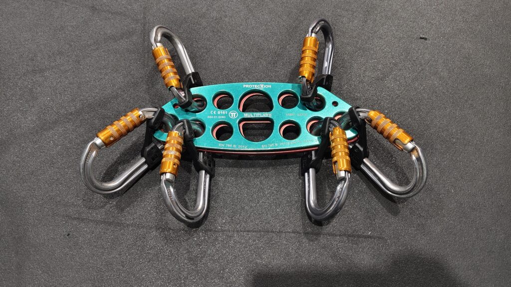 En rescate técnico e ITRA, una placa multi-anclaje certificada según la NFPA 2500 (antes NFPA 1983) garantiza que cumple con los requisitos de resistencia y seguridad para usarse como punto central de anclaje. Esto permite conectar en ella dos sistemas independientes, manteniendo la redundancia y una correcta distribución de cargas.