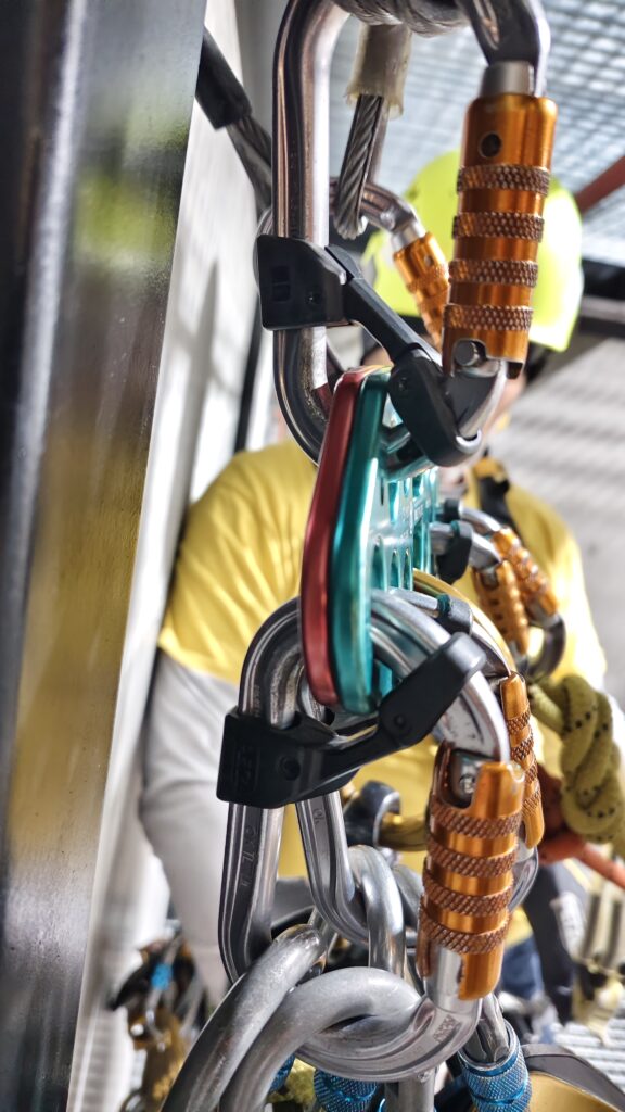 He visto muchas veces mosquetones mal cerrados o conectados a medias. La cinta actúa como doble punto de control visual y táctil, ayudando al técnico a fijarse bien en su conexión. Esto reduce el riesgo en momentos de fatiga, estrés o incluso exceso de confianza. Esto funciona!
